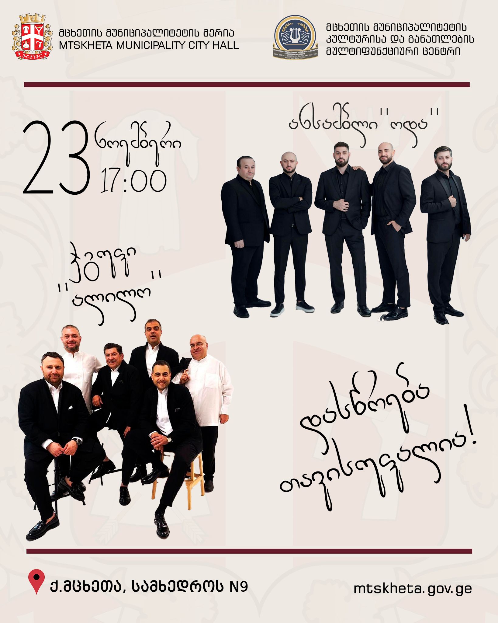მცხეთის მუნიციპალიტეტის მერიის მხარდაჭერითა და მცხეთის კულტურისა და განათლების მულტიფუნქციური ცენტრის ორგანიზებით, 23 ნოემბერს, 17:00 საათზე, გიორგობისადმი მიძღვნილი სადღესასწაულო კონცერტი გაიმართება.